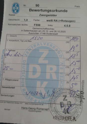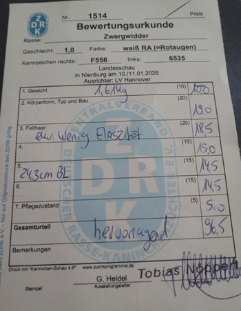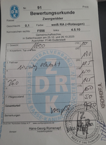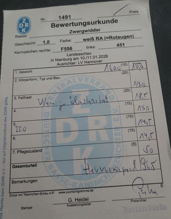 Zwergwidder Weiß RA sind zur Zeit noch einige Rammler und Häsinnen abzugeben. Die Tiere sind ebenfalls auf Landes/Vereinsschau zwischen 96 und 97 Punkten bewertet Unsere Zwergwidder Weiß RA stammen aus der Linie von Christopher Weicker.