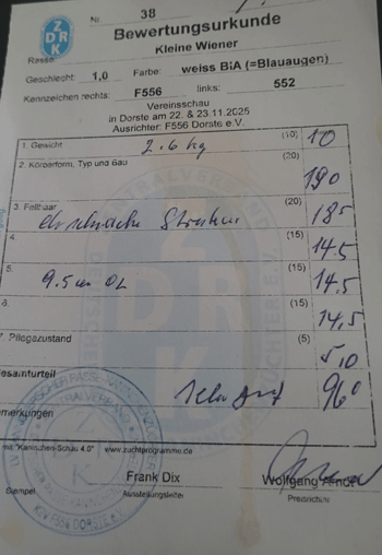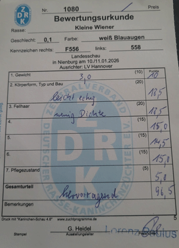 Kleine Wiener Weiß Bla sind noch 1 Rammler und 2 Häsinnen abzugeben. Die Tiere sind ebenfalls auf der Landes/Vereinsschau zwischen 96 und 96,5 bewertet Die Tiere sind reine Nachzuchten von Gerrit Steenhoff